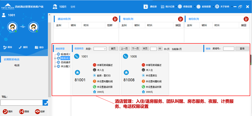 - 豐富的酒店電話功能。包括:智能總機、來電排隊、多語言歡迎詞、背景音樂、電話錄音、移動分機、留言點燈、智能轉接、夜服等。- 提供經濟實用的酒管軟件(入住/退房、叫醒、計費等),滿足中小型酒店日常管理需求,降低投入成本。