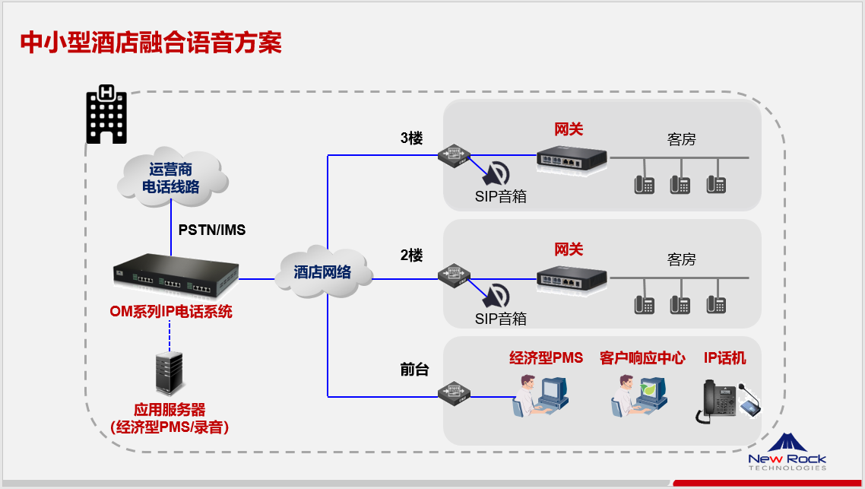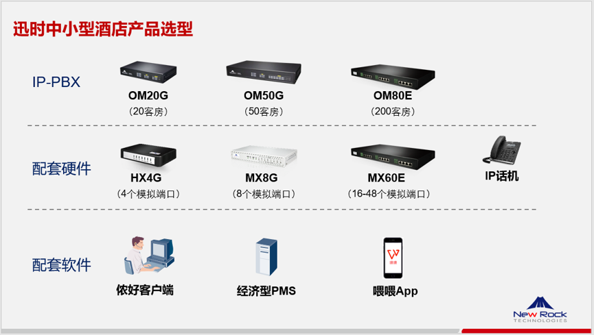 迅時中小型酒店電話方案,以OM系列IP電話交換機(IP-PBX)為核心,配套IAD分布式部署,以及經濟型PMS酒管軟件,為酒店提供經濟實用的融合通信方案。