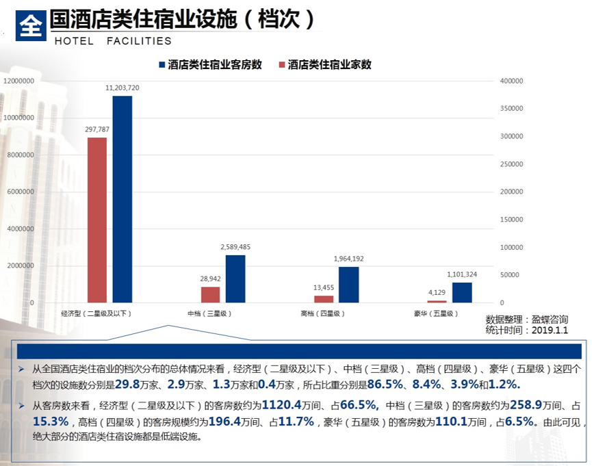 在《迅時重磅發布酒店電話解決方案2.0》一文中,我們把酒店分為三大類:高星級酒店(四星級及以上)、中小型酒店(三星級及以下)、連鎖型酒店。其中,數量最多的一類是中小型酒店,占比95%。參見下圖,節選自《2019中國大住宿業發展報告》。