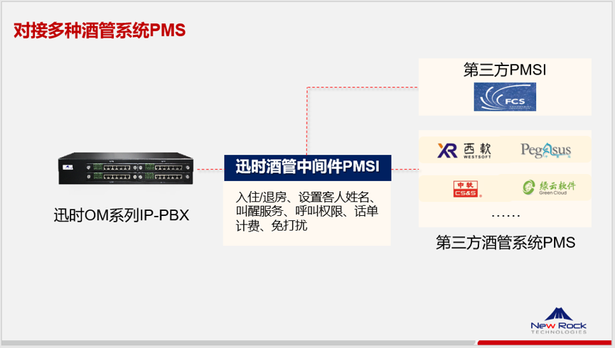 - 對接主流酒管系統PMS,提供豐富的酒店業務管理功能。包括:入住/退房、叫醒、計費、客人姓名顯示、呼叫權限、免打擾等。