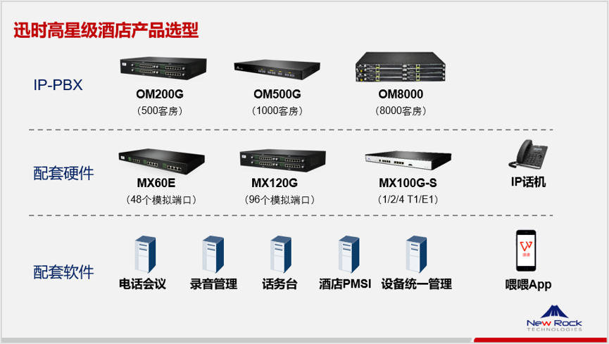 對于高星級酒店來說,它的“高星”,不光體現在極盡豪華的格調、優雅舒適的環境、溫馨熱情的服務、方便快捷的設施……還體現在高可靠、高效率、智能化的電話系統上!迅時高星級酒店電話方案,以OM系列IP電話交換機(IP-PBX)為核心,配套酒店管理系統對接接口,與主流的酒店管理系統PMS互聯互通,為酒店提供完整的融合通信方案。
