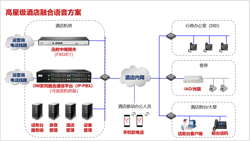 1、按需部署迅時OM系列大型IP-PBX(IP電話交換機,可選雙機熱備),單點最大支持8000用戶,滿足大部分酒店的電話需求,包括:智能總機、來電排隊、多語言歡迎詞、一房多機、電話錄音、留言點燈、智能轉接等。