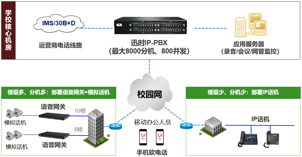 學校校區內往往有多棟建筑、樓宇之間距離遠,電話成為校區內部人員協同辦公直接有效的手段。迅時校園分布式親情電話部署方案,充分利用校園網絡,將IP語音融合至教室、辦公室、宿舍、調度室、門衛室等多個場所,有效降低電話系統的部署成本和維護成本。