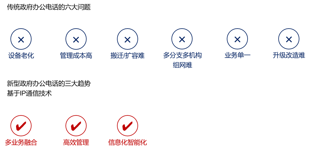 2016年,中共中央辦公廳、國務(wù)院辦公廳印發(fā)了《國家信息化發(fā)展戰(zhàn)略綱要》,提出大力推進(jìn)信息化,實(shí)現(xiàn)“網(wǎng)絡(luò)強(qiáng)國”“數(shù)字中國”等目標(biāo)。政府機(jī)構(gòu)作為信息化建設(shè)的先行者,也開始朝著基于IP網(wǎng)絡(luò)的數(shù)據(jù)、語音、視頻融合的方向發(fā)展,以實(shí)現(xiàn)政府辦公的信息化、智能化。另一方面,政府機(jī)構(gòu)原來采用的傳統(tǒng)電話交換機(jī),已無法滿足光進(jìn)銅退、移動辦公、與下屬機(jī)構(gòu)電話組網(wǎng)等與時俱進(jìn)的政府辦公通信需求;還面臨著硬件使用壽命到期、日常維護(hù)成本大幅增加的問題,急需升級換代。