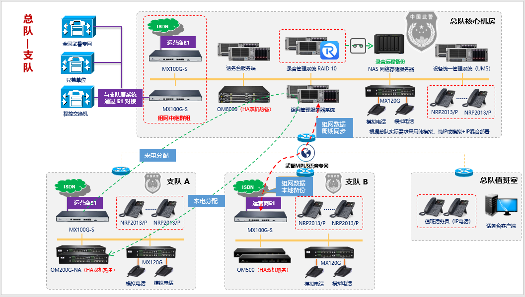 - 每個支隊部署迅時OM200G或迅時OM500 IP-PBX,通過數字中繼網關與現有系統進行擴容對接