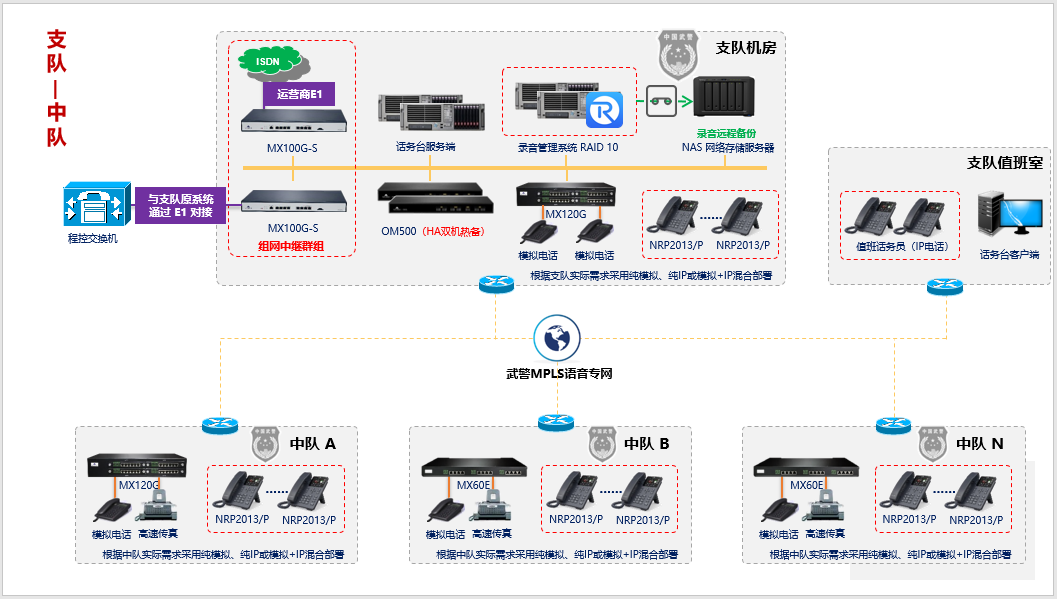 - 每個中隊按容量部署一臺IAD,并注冊到支隊的IP-PBX