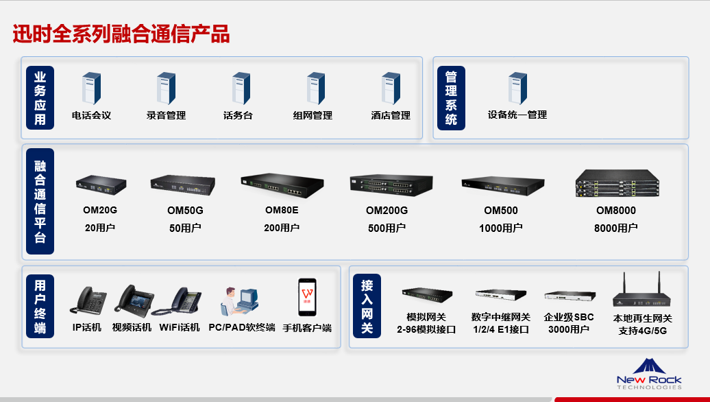 - 部署迅時OM8000 IP-PBX,通過數字中繼網關與現有系統進行對接。IP-PBX可通過IP注冊方式連接到運營商IMS平臺- 部署網管監控系統,對全網設備進行統一監控和集中運維