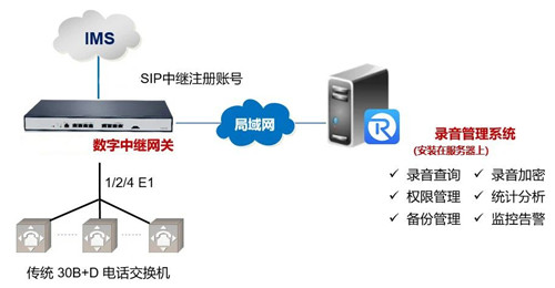 數字中繼網關提供1/2/4個E1接口和512個SIP中繼賬號注冊,幫助企業原有程控電話交換機接入運營商IMS平臺。所有經過數字中繼網關的通話直接生成錄音,并將錄音文件存儲在服務器上,通過錄音管理系統對錄音進行集中管理。