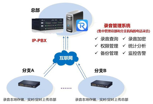 - 分布式錄音,集中式管理:分支機構部署小型IP電話交換機(IP-PBX),錄音存在設備內置存儲;總部部署大中型IP電話交換機和錄音管理系統,統一管理總部和各分支機構的電話錄音。