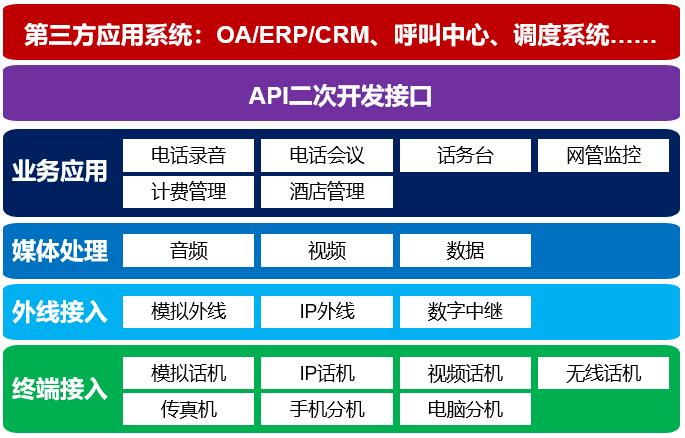 - 融合通信業(yè)務(wù):電話錄音、電話會議、電話組網(wǎng)、視頻通話、移動(dòng)分機(jī)、話務(wù)臺等。